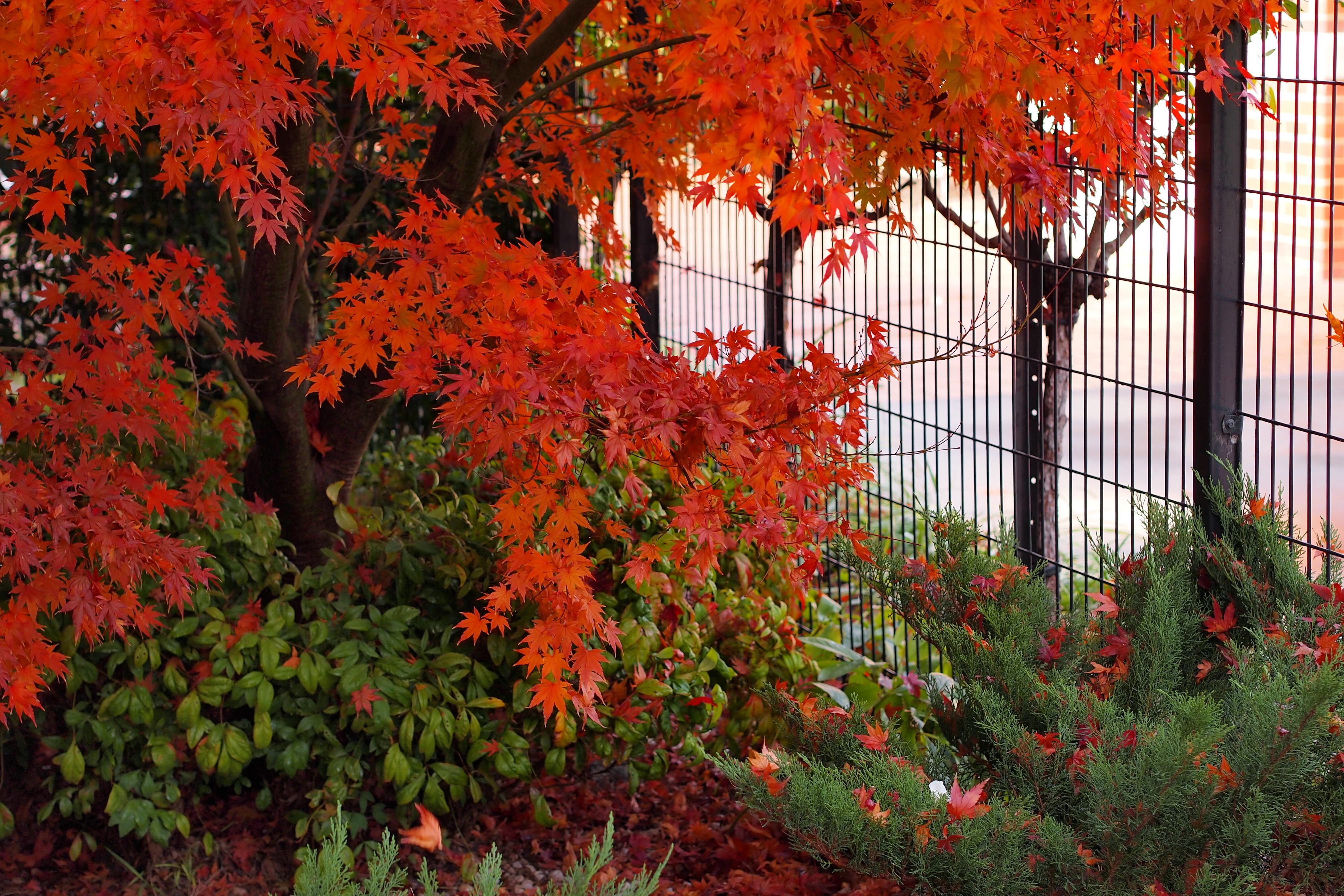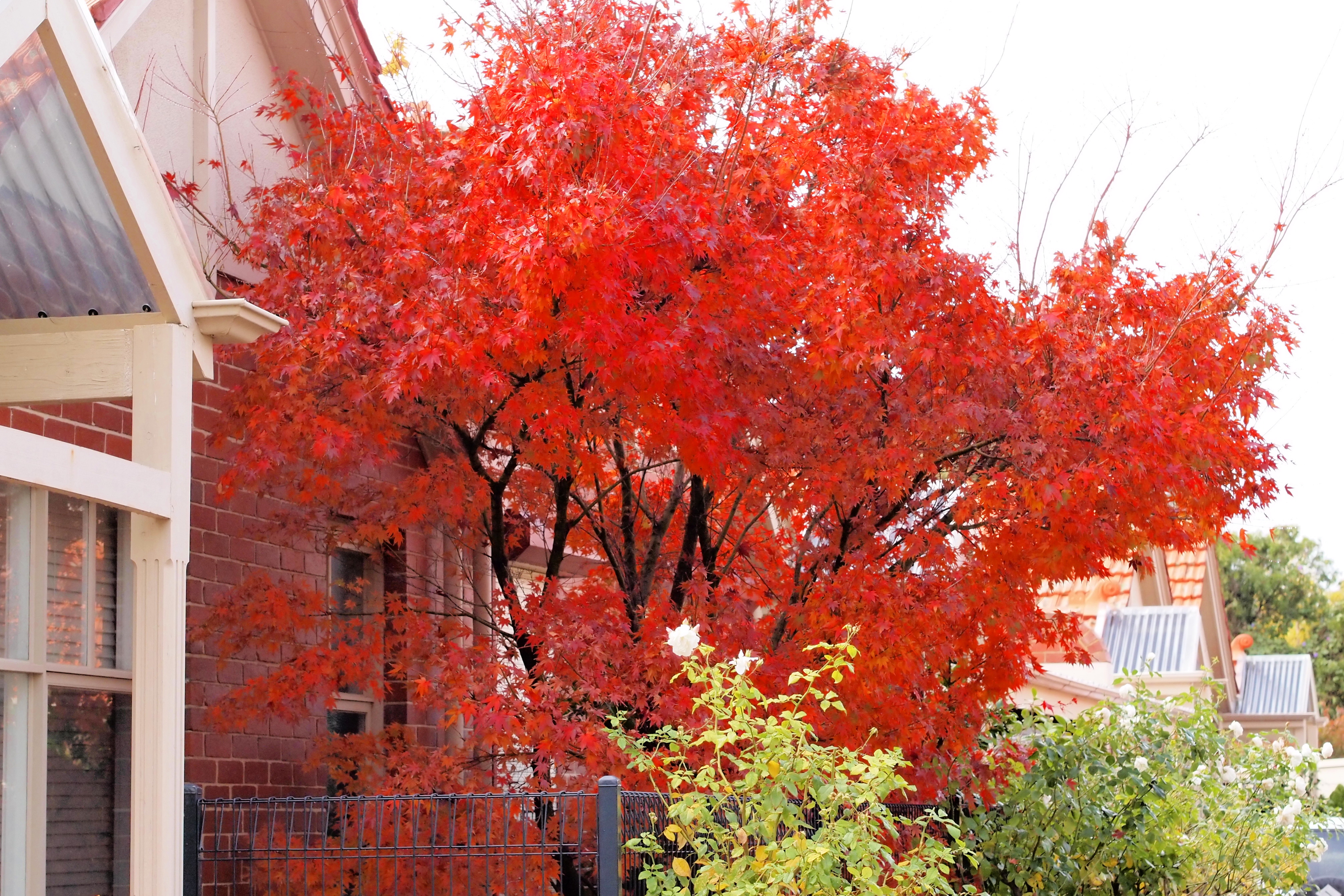 そして、表に出ると、玄関脇にもみじの木。日本のように冷え込まないので、色はあまり鮮やかではないが、一応紅葉する。手前に白いバラが季節はずれの花を付けていたりするのがメルボルンらしい。なにしろ一日の中に四季があるって言われているぐらいだからね。