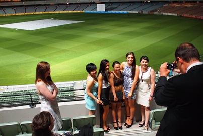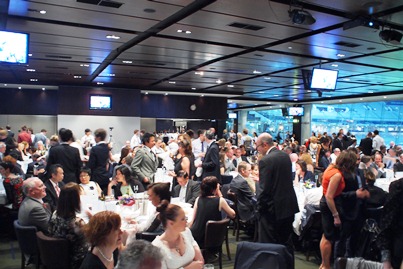 生徒も親も教師もやがてテーブルを離れ、いろいろな人と談笑する。ステージに向かって左側はガラス張りで、MCGのグラウンドと10万人収容のスタンドが一望できる。MCGのご好意で、グランドもライトアップされ会場の一方に幻想的な一大風景画を提供してくれる。ドアを開ければ、観客席に降りることもでき、少々暑くなった会場から夕涼みにでる生徒たちで常ににぎわっていた。