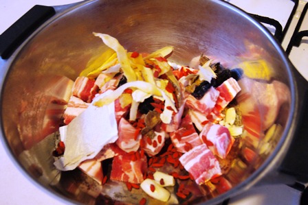 にんにく数粒と,豚の三枚肉を適当に切ってなべに入れ,(実際には,長時間煮るわけではないので,三枚肉の皮は除いた。)