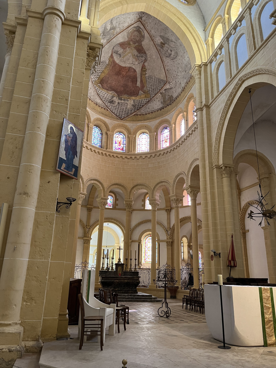 午前中はParay-le-Monialの散策。まず目指すは, ずっと気になっていた大聖堂。 ホテルのそばにあり, 部屋窓を開けると真正面に見えるBasilique du Sacré-Cœurである。聖堂の回り, 付属する施設や聖像などを一通り巡り, 聖堂の中に入った。当然ながら静かな聖堂の中, 祈りを捧げる人もいたりして, 物見遊山の我々は少し肩身が狭い。また聖堂横の中庭も凛とした緊張感に包まれ, 心が洗われる。