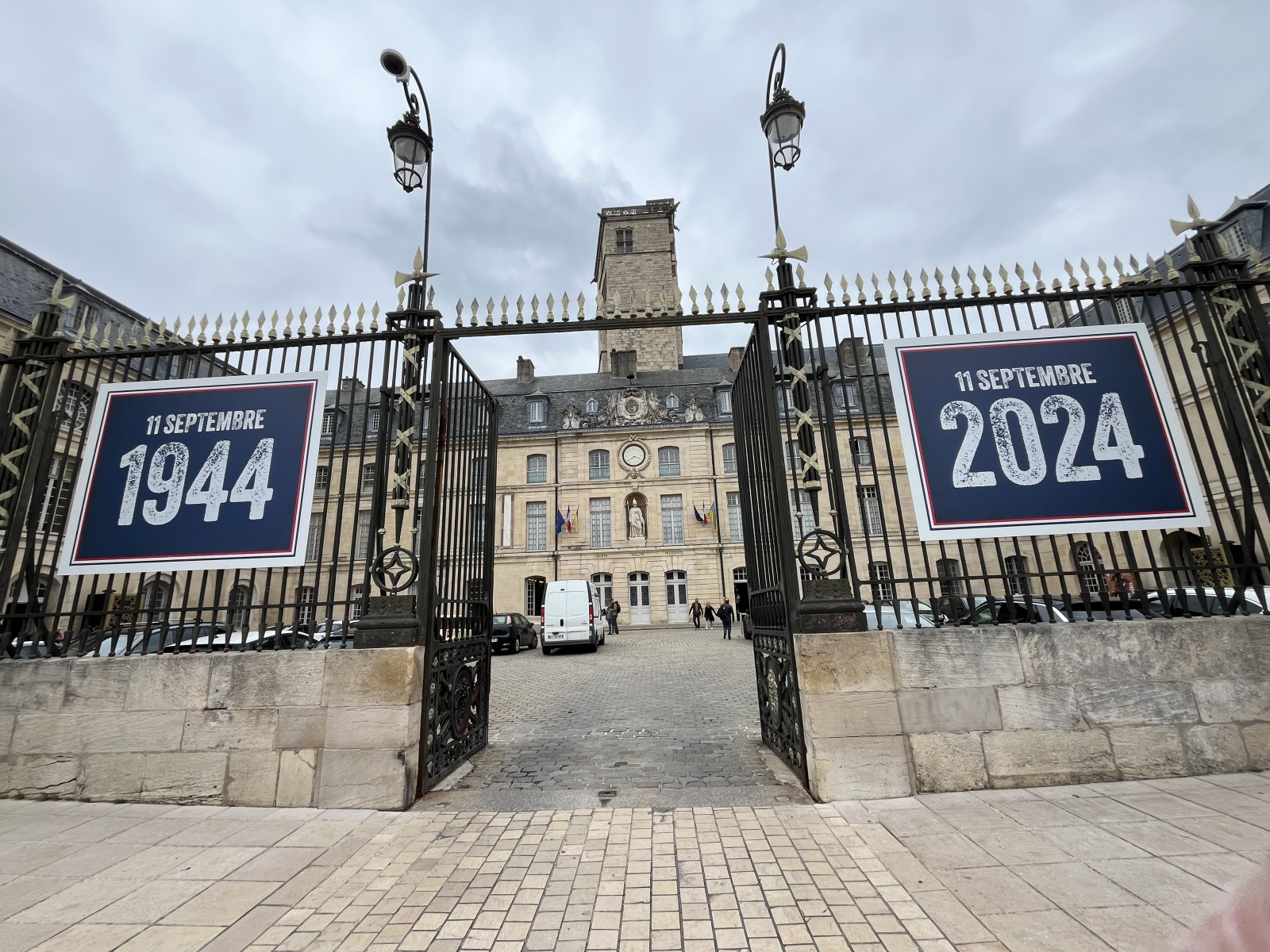 ブルゴーニュ公宮殿の門の左右にはおおきなパネルが貼ってあった。左に「11 SEPTEMBRE 1944」, 右に「11 SEPTEMBRE 2024」と書いてある。9月11日は, 今では9.11という忌まわしい出来事の日という認識があるが, ディジョンにおいてはナチス・ドイツから開放された日という別の意味を持つようだ。それが1944年だったので, 今年はそれから80年。数日前がこの80周年の記念日だったわけだ。