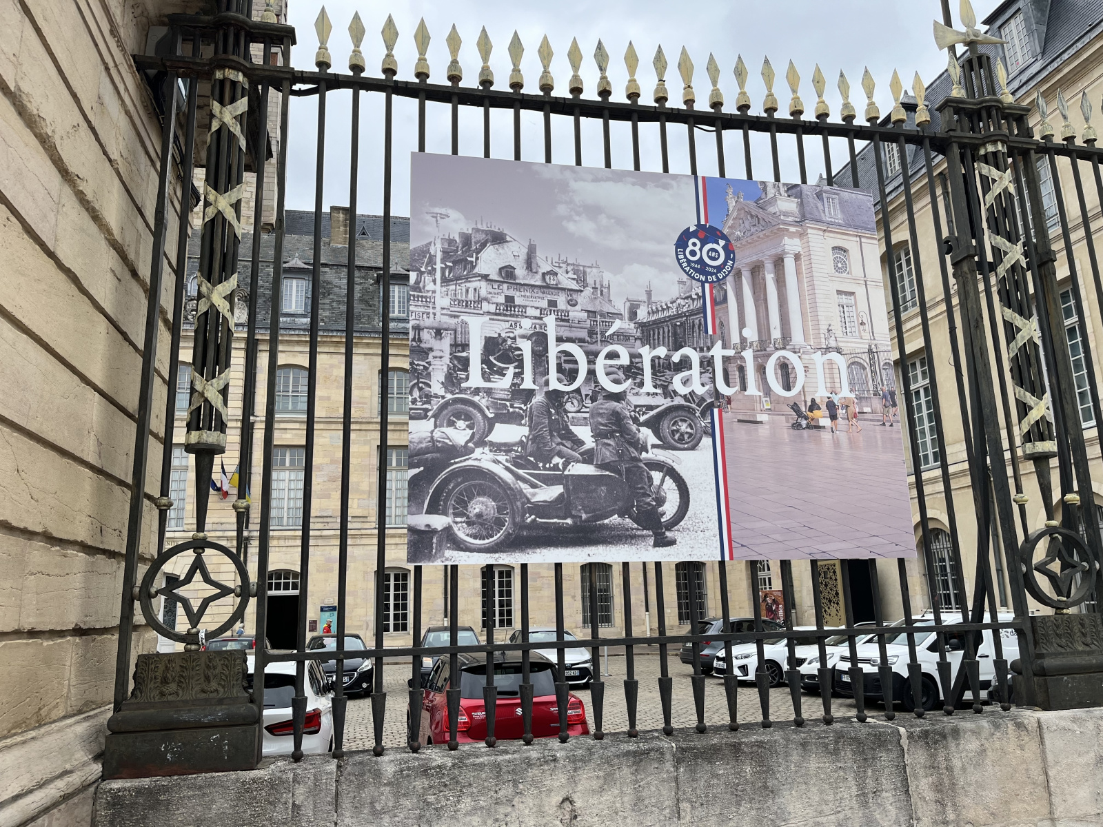 ブルゴーニュ公宮殿の門の左右にはおおきなパネルが貼ってあった。左に「11 SEPTEMBRE 1944」, 右に「11 SEPTEMBRE 2024」と書いてある。9月11日は, 今では9.11という忌まわしい出来事の日という認識があるが, ディジョンにおいてはナチス・ドイツから開放された日という別の意味を持つようだ。それが1944年だったので, 今年はそれから80年。数日前がこの80周年の記念日だったわけだ。