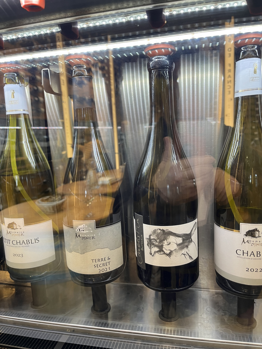 入ると真ん中にカウンターがあるが, その回りを囲む壁にぎっしりとワインが陳列されている。そして目の高さあたりにはセルフサーバーがあり, ガラスケースに入っているワインを試飲できる仕組みだ。