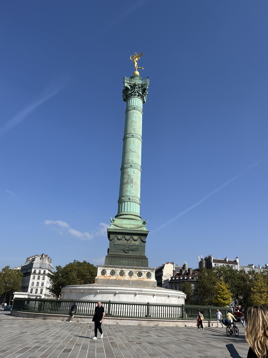 幸いすぐに部屋に入れたので, 部屋に荷物を置いて,まずは近辺を散策。Place de la Bastille (バスティーユ広場)まで歩いてみた。ここにはまだオリンピックの五輪やパラリンピックのシンボルマークのモニュメントが残っていた。閉会してまだ1ヶ月と経たないからね。